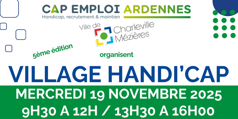 Cap emploi 08 et la ville de Charleville-Mézières organisent la 5ème édition du Village Handi'Cap sur la thématique : " HANDICAPS ET EMPLOI : L'EGALITE POUR TOUTES ET TOUS ! " Venez à la rencontre : - des employeurs pour échanger en direct avec les recruteurs, - des professionnels de la formation, de l'emploi et du handicap. Nous vous proposons également : - des ateliers de réalité virtuelle pour découvrir les métiers et les solutions de mobilité, - des animations, un Escape Game géant, une exposition sur la Loi du 11 février 2005 pour l'égalité des droits et des chances, la participation et la citoyenneté des personnes en situation de handicap. Horaires: 9h30/12h00 et 13h30/16h00 Entrée libre - Pensez à vous munir d'un CV