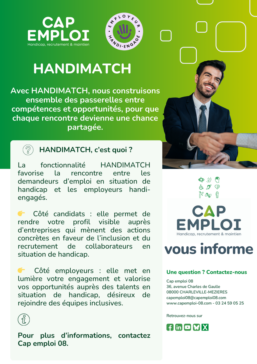 Pour davantage d’informations, contactez votre conseiller au 03 24 59 05 25 ou par mail à capemploi08@capemploi08.com