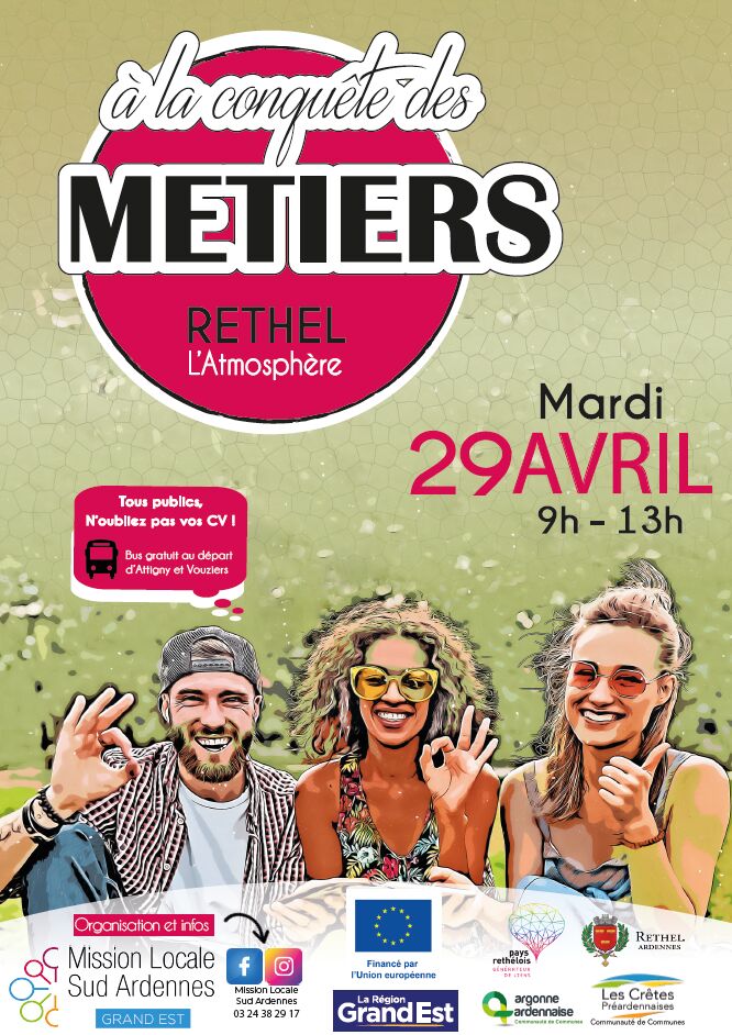 Nous avons le plaisir de vous convier à notre Forum « A LA CONQUETE DES METIERS Le Mardi 29 avril de 9h00 à 13h à la salle l’Atmosphère à Rethel (ouvert à tous, entrée libre).