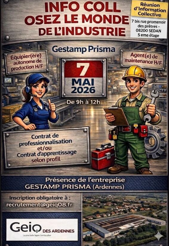 Nous organisons le 7 mai de 9h00 à 12h00 une réunion d’information collective avec l’entreprise GESTAMP PRISMA avec pour projet de recruter leurs futurs alternants en maintenance industrielle et production.
