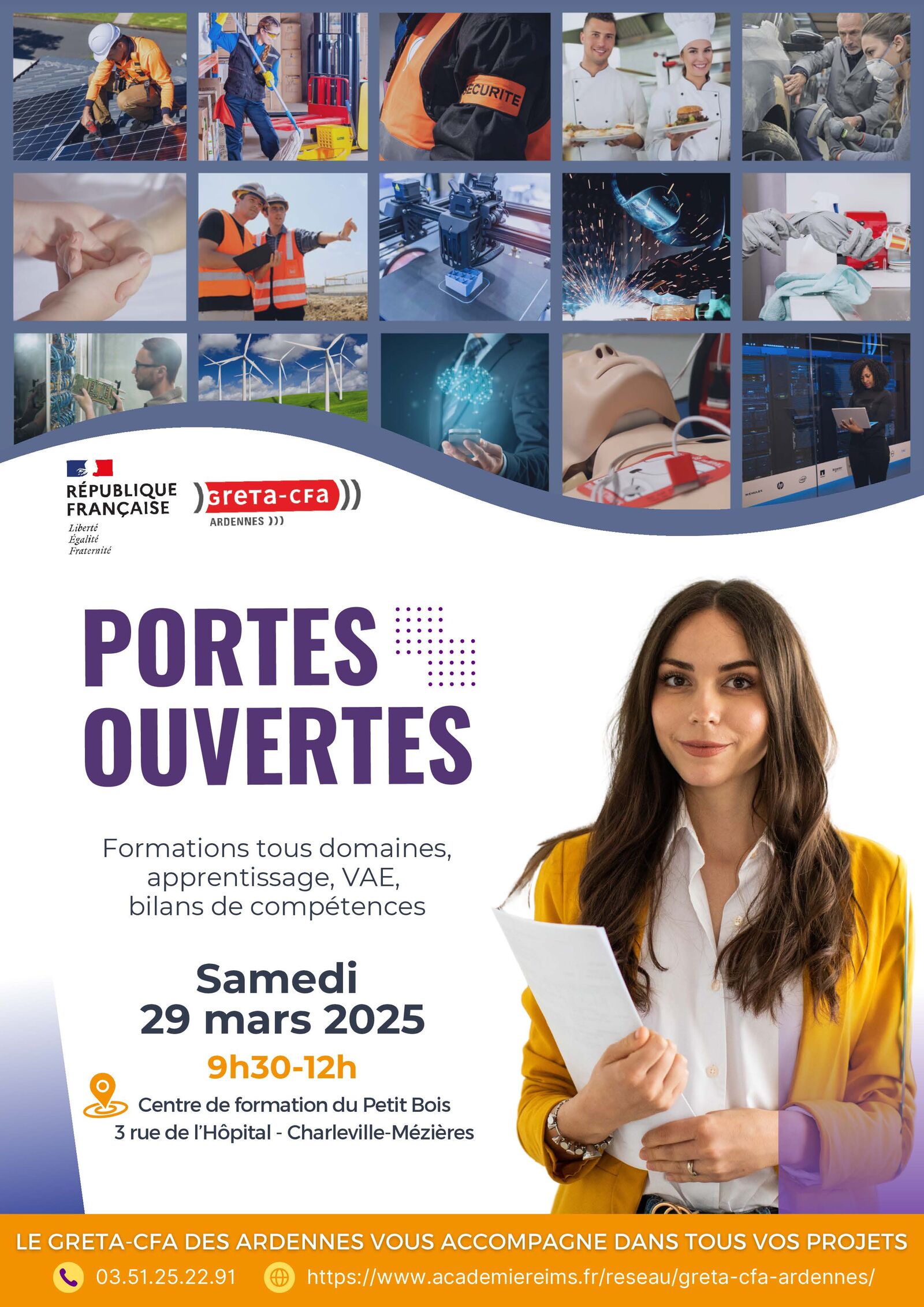 Le GRETA-CFA des Ardennes organise le samedi 29 mars 2025 de 9 h 30 à 12 h , ses portes ouvertes au sein du centre de formation du Petit Bois (entrée : 3 rue de l’Hôpital à Charleville-Mézières).