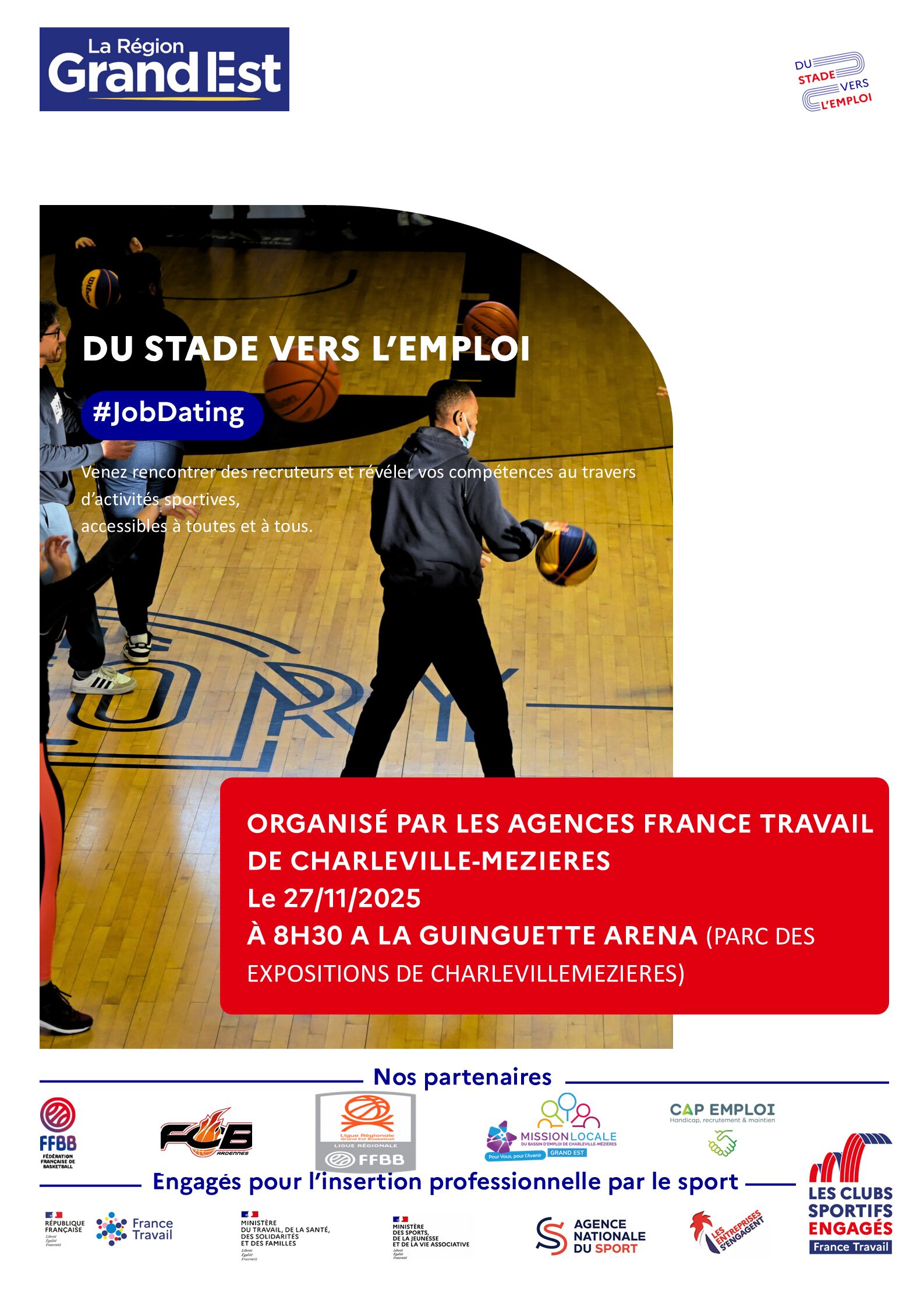 Les agences FRANCE TRAVAIL de Charleville-Mézières Val-de-Vence et Montjoly organisent en partenariat avec la ligue du basket et les FLAMMES CAROLO BASKET l’opération "Du Stade Vers l’Emploi " le jeudi 27 Novembre 2025 dans la salle GUINGUETTE ARENA (Parc des expositions de CHARLEVILLE-MEZIERES).