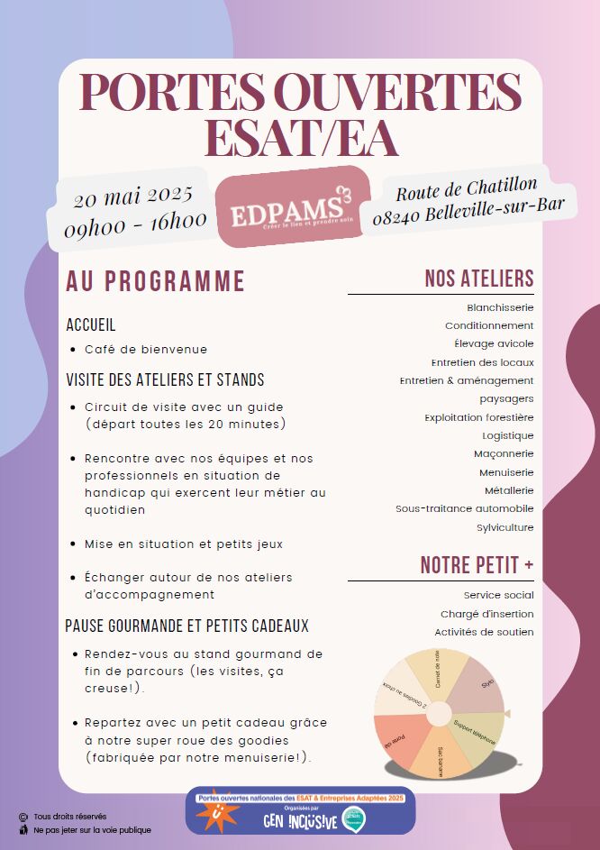Portes ouvertes de l'ESAT/EA de l'EDPAMS le Mardi 20 mai 2025 de 9h00 à 16h00