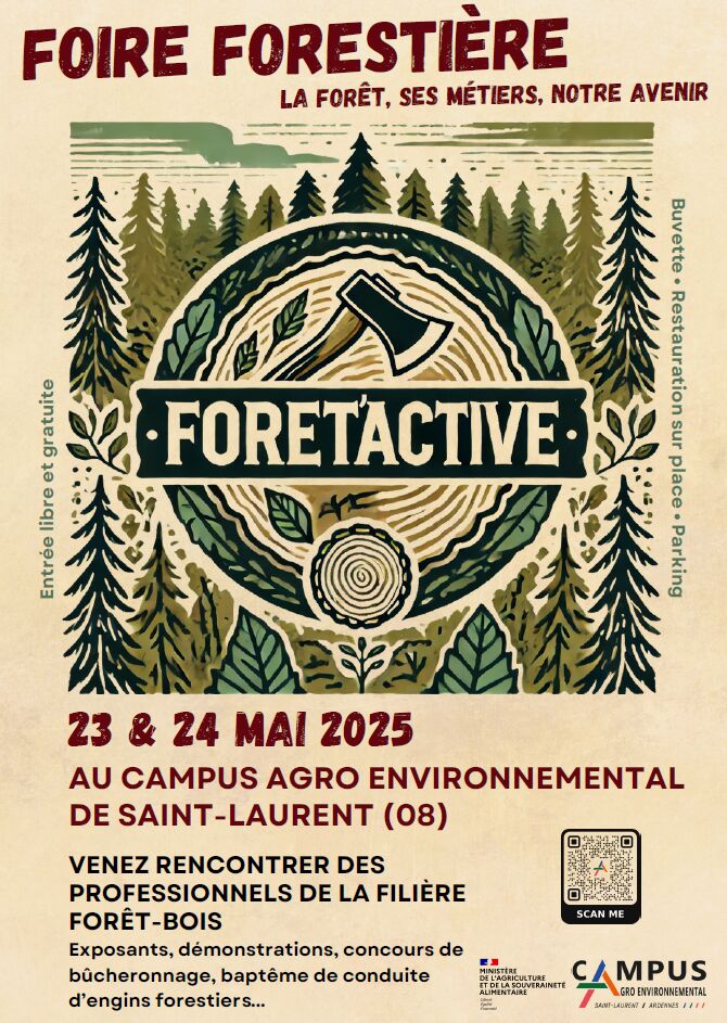 Nous avons le plaisir de vous inviter à participer à la Foire Forestière, "Forêt-active" une journée dédiée à la découverte de la filière Forêt-Bois, qui se tiendra le vendredi 23 mai 2025, de 9h30 à 16h30 au sein de notre établissement.