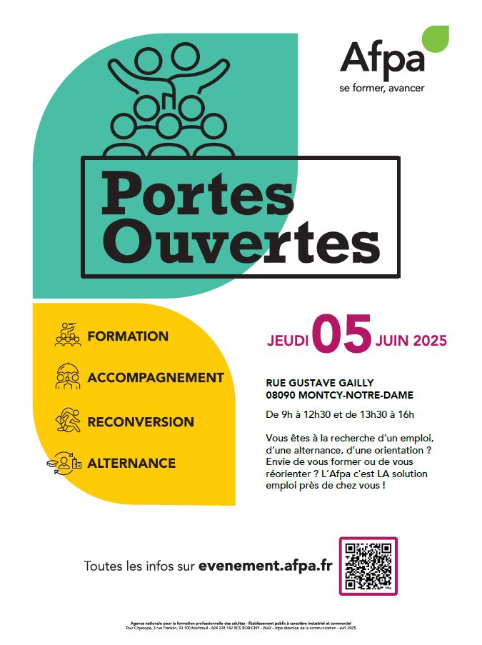 JEUDI 5 juin 2025, le centre Afpa de MONTCY NOTRE DAME ouvre ses portes de 9h00 à 12h30 et de 13h30 à 16h00 à tous les publics, demandeurs d'emploi ou salariés, à la recherche d'un accompagnement, d’une formation, d'une reconversion ou d'un emploi !